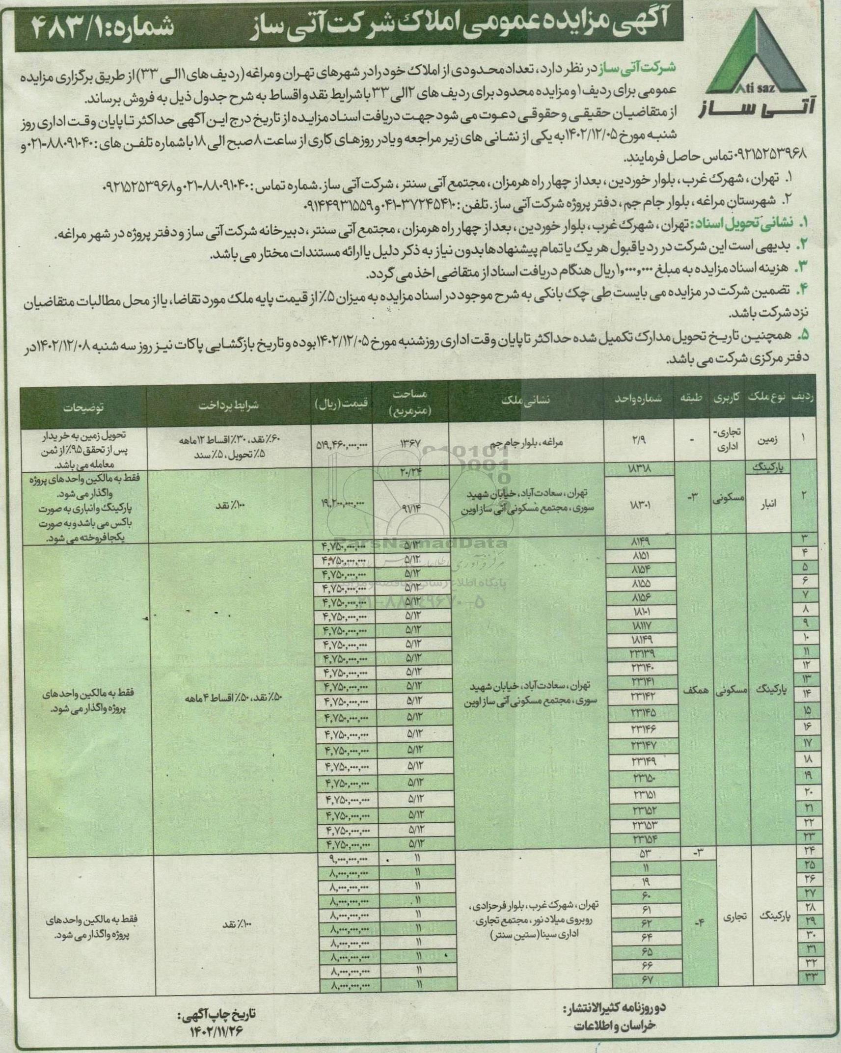 شرکت آتی ساز در نظر دارد تعداد محدودی از املاک خود را در شهرهای تهران و مراغه به فروش برساند.
