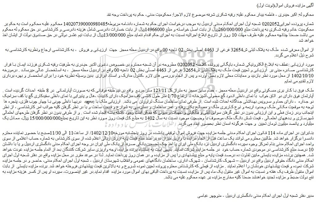 از اموال معرفی شده ملک به پلاک ثبتی ش32654 فرعی از 4463 اصلی بخش 02 ناحیه 00 واقع در اردبیل محله معجز جهت ارزیابی و فروش ، به کارشناسی ارجاع ونظریه کارشناسی به شرح ذیل اعلام می گردد.