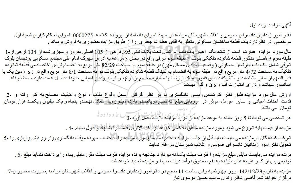 . 7-مزایده به تاریخ142/12/23  روز چهارشنبه راس ساعت 11 صبح در دفترامور زندانیان دادسرا عمومی و انقلاب شهرستان مراغه بصورت حضوری برگزار خواهد شد. قاضی ناظر زندان – سید حسین موسوی تبار