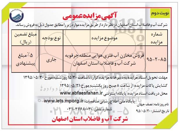 مزایده فروش مخازن آب فلزی هوایی منطقه جرقویه نوبت دوم, آگهی مزایده عمومی , مزایده فروش مخازن آب فلزی هوایی منطقه جرقویه نوبت دوم