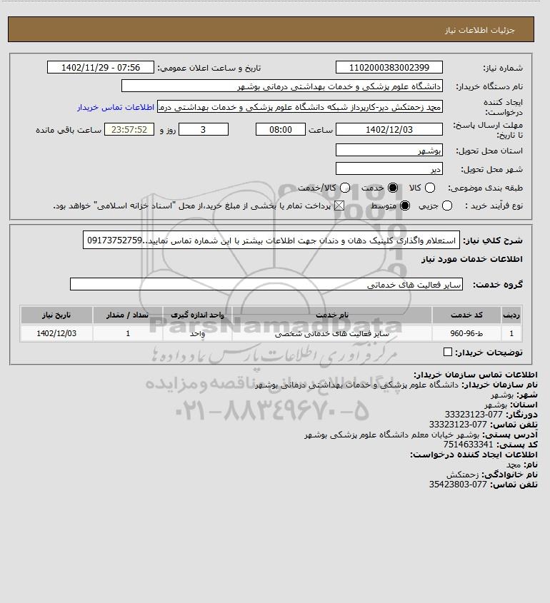 شرح کلی نیاز: استعلام واگذاری کلینیک دهان و دندان جهت اطلاعات بیشتر با این شماره تماس نمایید..09173752759