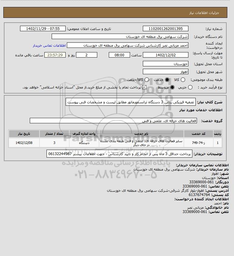 شرح کلی نیاز: تصفیه فیزیکی روغن 3 دستگاه ترانسفورماتور مطابق لیست و مشخصات فنی پیوست