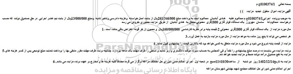 به موجب پرونده  اجرایی0100374/1ج م محکوم علیه    هادی آبادیان  محکوم است به پرداخت مبلغ 261/346/000ریال از بابت اصل خواسته  وهزینه دادرسی وتاخیر تادیه  ومبلغ 13/000/000ریال از بابت نیم عشر اجرایی  در حق صندوق دولت  که حسب درخواست  محکوم له    ساسان  مهرورز  یک دستگاه کولر گازی 1800گری  معمولی متعلق به  هادی آبادیان  از طریق  مزایده حضوری بفروش می رسد