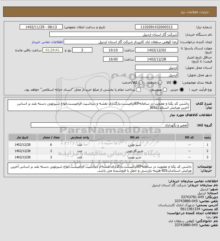 2 | -- | شیر گاز توپی | عدد | 2 | 1402/12/28 |