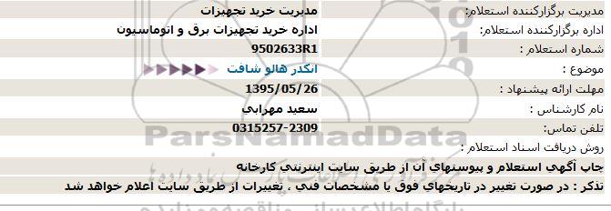 استعلام بها و موضوع استعلام استعلام , استعلام انکدر هالو شافت به اطلاع کلیه شرکتها و افراد متخصص واجد شرایط میرساند، آگهی گذار در نظر دارد از طریق استعلام بها، نسبت به انتخاب و دریافت پیشنهادات اقدام نماید. این استعلام با کد آگهی ثبت شده در سامانه خبرگزاری پارس نماد : 708071 منتشر شده است. مشخصات استعلام : تاریخ شروع استعلام: 1395/05/20 آخرین مهلت ارسال پیشنهاد قیمت : 1395/05/26 و محل اجرای پروژه : استان اصفهان میباشد. استعلام قیمت مورد درخواست : استعلام , استعلام انکدر هالو شافت با دستهبندیهای تخصصی و گروه های مرتبط : تجهیزات و ماشین آلات صنعتی, استعلام اطلاع رسانی میگردد.