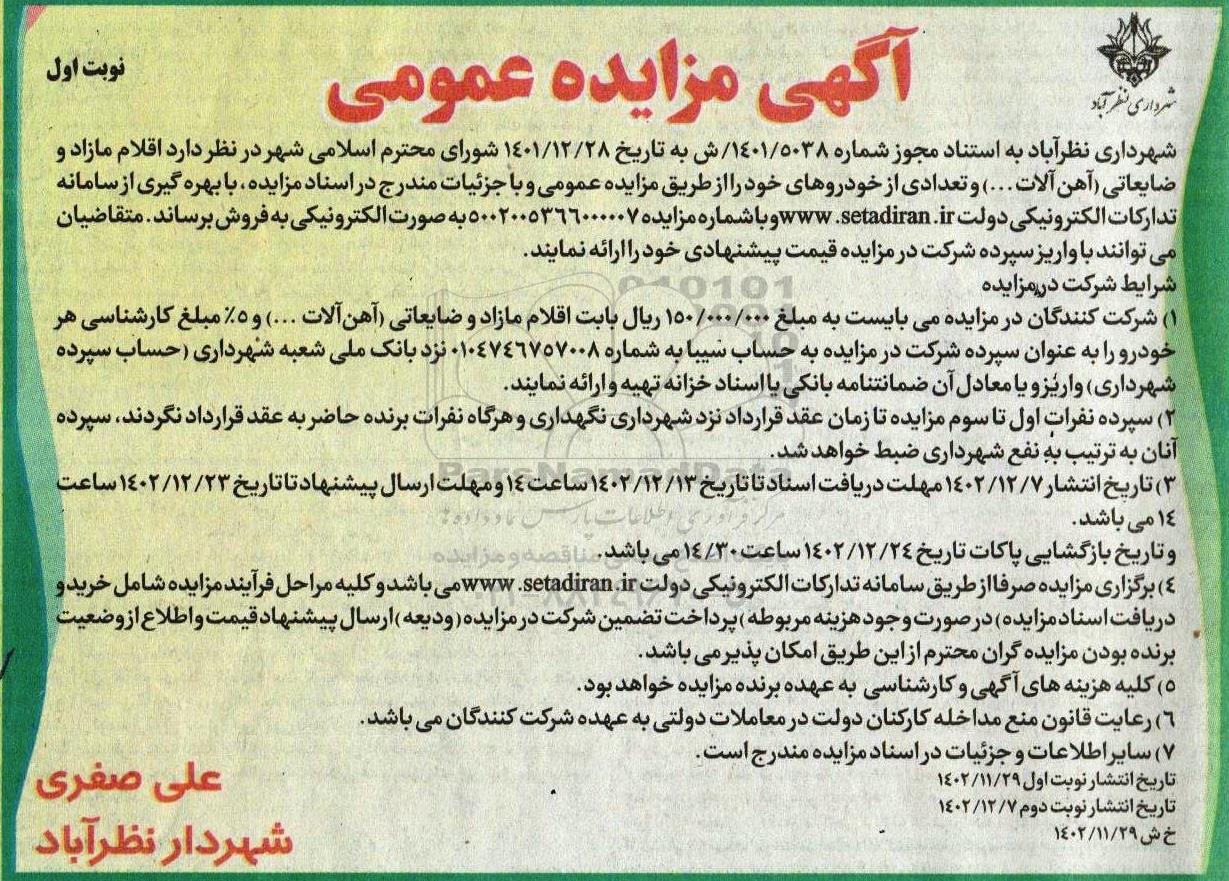 شهرداری نظرآباد به استناد مجوز شماره 1401/5038 ش به تاریخ 1401.12.28 شورای محترم اسلامی شهر در نظر دارد اقلام مازاد و ضایعاتی (آهن آلات ...) و تعدادی از خودروهای خود را از طریق مزایده عمومی و با جزئیات مندرج در اسناد مزایده با بهره گیری از سامانه تدارکات الکترونیکی دولت ستاد ایران و با شماره مزایده 5002005366000007 به صورت الکترونیکی به فروش برساند. متقاضیان می توانند با واریز سپرده شرکت در مزایده قیمت پیشنهادی خود را ارائه نمایند.