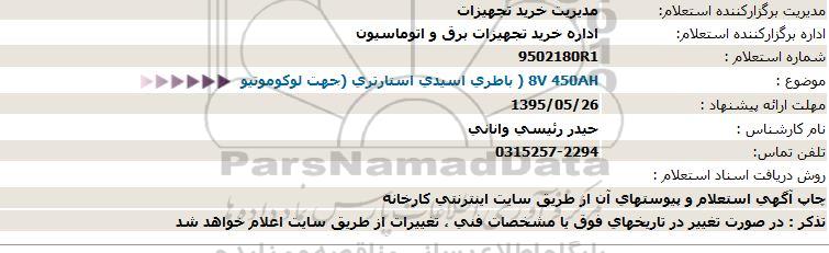 استعلام باطری اسیدی استارتری (جهت لوکوموتیو ) 87 450AH, استعلام , استعلام باطری اسیدی استارتری (جهت لوکوموتیو ) 87 450AH