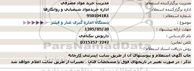 استعلام بها و موضوع استعلام استعلام , استعلام دستگاه اندازه گیری غبار و فیلتر به اطلاع کلیه شرکتها و افراد متخصص واجد شرایط میرساند، آگهی گذار در نظر دارد از طریق استعلام بها، نسبت به انتخاب و دریافت پیشنهادات اقدام نماید. این استعلام با کد آگهی ثبت شده در سامانه خبرگزاری پارس نماد : 708480 منتشر شده است. مشخصات استعلام : تاریخ شروع استعلام: 1395/05/21 آخرین مهلت ارسال پیشنهاد قیمت : 1395/05/30 و محل اجرای پروژه : استان اصفهان میباشد. استعلام قیمت مورد درخواست : استعلام , استعلام دستگاه اندازه گیری غبار و فیلتر با دستهبندیهای تخصصی و گروه های مرتبط : انواع فیلتر های تصفیه, خدمات و تجهیزات آزمایشگاهی و پزشکی, مشاوره زیست محیطی, استعلام اطلاع رسانی میگردد.