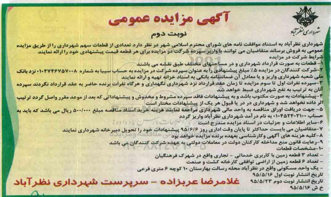 مزایده عمومی مزایده فروش تعدادی از قطعات سهم شهرداری نوبت دوم برگزار میگردد. از کلیه افراد متخصص و شرکتهای واجد شرایط دعوت به عمل میآید تا در این مزایده با کد خبرگزاری پارس نماد : 708630 شرکت نمایند تاریخ شروع مزایده : 1395/05/23 مهلت شرکت در مزایده: تا پایان روز 1395/06/06 مکان برگزاری اموال واگذاری استانهای البرز و دستهبندیهای مربوط به این حراجی املاک و زمین میباشد.