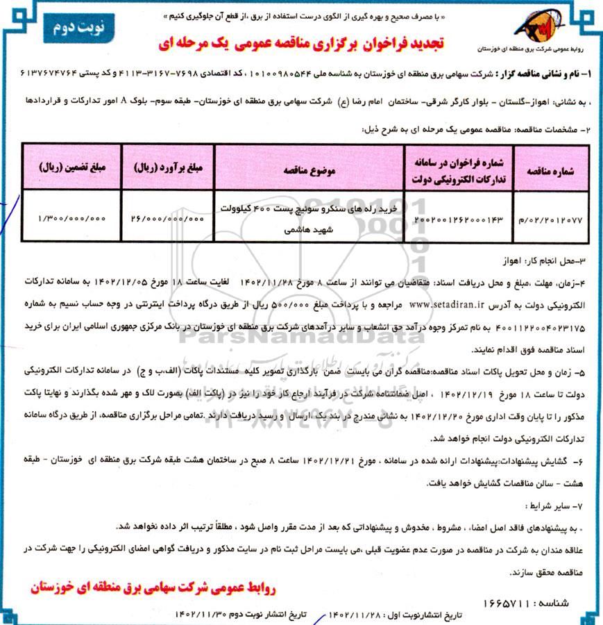 گشایش پیشنهادات : پیشنهاد ارائه شده در سامانه، مورخ 1402.12.21 ساعت 8 صبح در ساختمان هشت طبقه شرکت برق منطقه ای خوزستان - طبقه هشت - سالن مناقصات گشایش خواهد یافت .