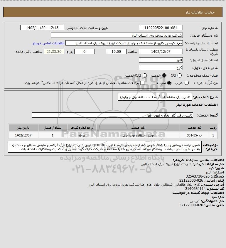 شرح کلی نیاز: تامین برق متقاضیان گروه 3 - منطقه برق چهارباغ