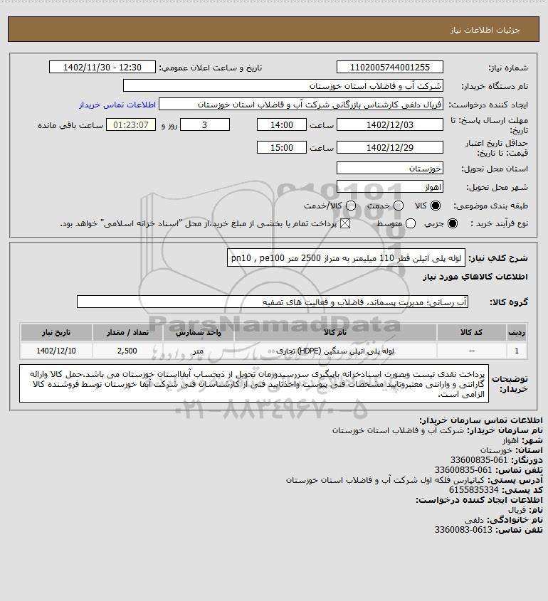 شرح کلی نیاز: لوله پلی اتیلن قطر 110 میلیمتر به متراژ 2500 متر pn10 , pe100