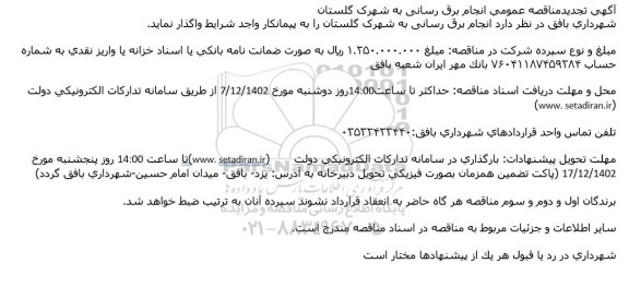 شهرداری بافق در نظر دارد انجام برق رسانی به شهرک گلستان را به پیمانكار واجد شرایط واگذار نماید.