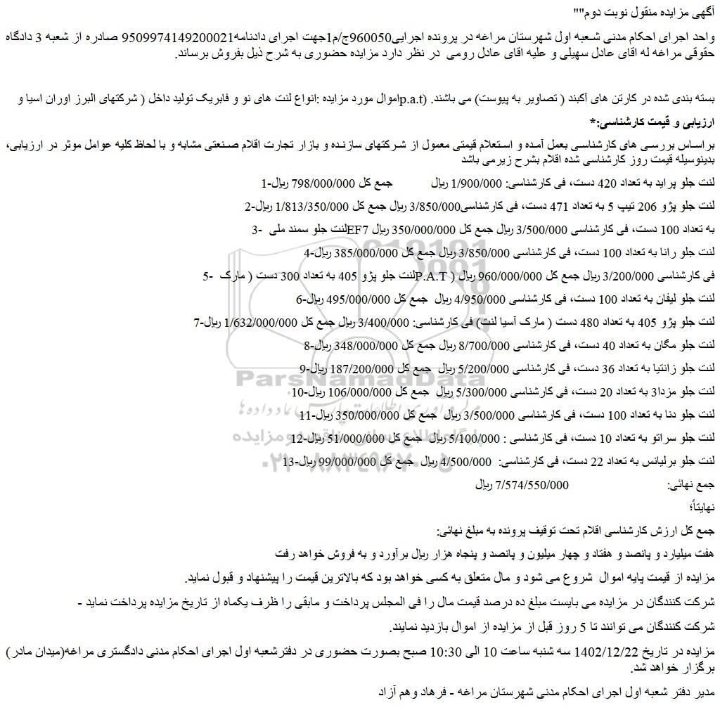 مزایده در تاریخ 1402/12/22 سه شنبه ساعت 10 الی 10:30 صبح بصورت حضوری در دفترشعبه اول اجرای احکام مدنی دادگستری مراغه(میدان مادر) برگزار خواهد شد.