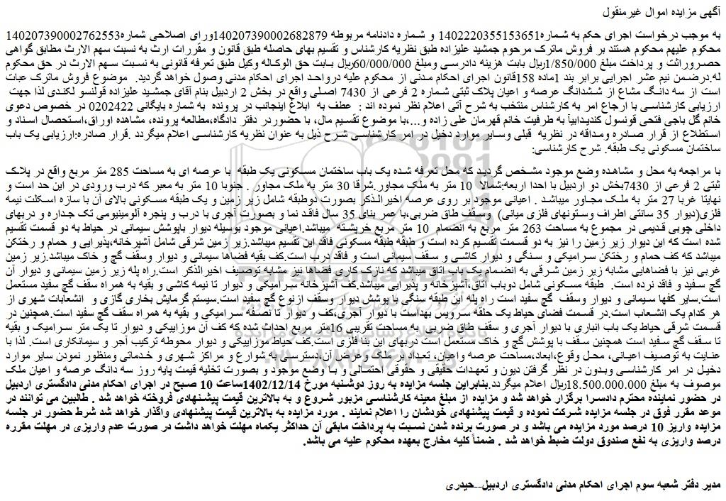 به موجب درخواست اجرای حکم به شماره1402220355153651 و شماره دادنامه مربوطه 140207390002682879ورای اصلاحی شماره140207390002762553 محکوم علیهم محکوم هستند بر فروش ماترک مرحوم جمشید علیزاده طبق نظریه کارشناس و تقسیم بهای حاصله طبق قانون و مقررات ارث به نسبت سهم الارث مطابق گواهی حصروراثت و پرداخت مبلغ 1/850/000ریال بابت هزینه دادرسی ومبلغ 60/000/000ریال بابت حق الوکاله وکیل طبق تعرفه قانونی به نسبت سهم الارث در حق محکوم له.درضمن نیم عشر اجرایی برابر بند 1ماده 158قانون اجرای احکام مدنی از محکوم علیه درواحد اجرای احکام مدنی وصول خواهد گردید. موضوع فروش ماترک عبات است از سه دانگ مشاع از ششدانگ عرصه و اعیان پلاک ثبتی شماره 2 فرعی از 7430 اصلی واقع در بخش 2 اردبیل بنام آقای جمشید علیزاده قولنسو لکندی لذا جهت ارزیابی کارشناسی با ارجاع امر به کارشناس منتخب به شرح آتی اعلام نظر نموده اند : عطف به ابلاغ اینجانب در پرونده به شماره بایگانی 0202422 در خصوص دعوی خانم گل باجی فتحی قونسول کندیدابیآ به طرفیت خانم قهرمان علی زاده و...،با موضوع تقسیم مال، با حضوردر دفتر دادگاه،مطالعه پرونده، مشاهده اوراق،استحصال اسناد و استطلاع از قرار صادره ومداقه در نظریه قبلی وسایر موارد دخیل در امر کارشناسی شرح ذیل به عنوان نظریه کارشناسی اعلام میگردد .قرار صادره:ارزیابی یک باب ساختمان مسکونی یک طبقه. شرح کارشناسی: