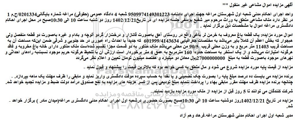 - مزایده در تاریخ 1402/12/21روز دوشنبه ساعت 10 الی 10:30صبح بصورت حضوری درشعبه اول اجرای احکام مدنی دادگستری مراغه(میدان مادر ) برگزار خواهد شد.