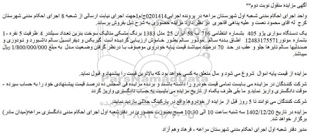 واحد اجرای احکام مدنی شعبه اول شهرستان مراغه در پرونده اجرایی0201414ج/م1جهت اجرای نیابت ارسالی از شعبه 8 اجرای احکام مدنی شهرستان کرج له اقای محمود نعمت و علیه پناهی اقاجری در نظر دارد مزایده حضوری به شرح ذیل بفروش برساند.