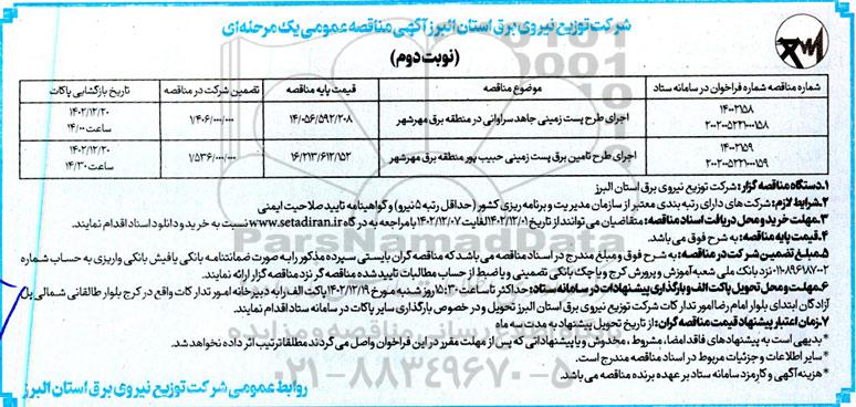 اجرای طرح تامین برق پست زمینی حبیب پور منطقه برق مهرشهر | 16.213.612.152 | 1.536.000.000 | 1402.12.20 ساعت 14:30 |
