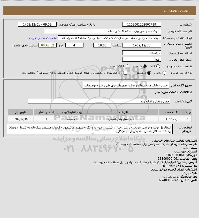 شرح کلی نیاز: حمل و بارگیری و انتقال و تخلیه تجهیزات برق طبق شرح توضیحات