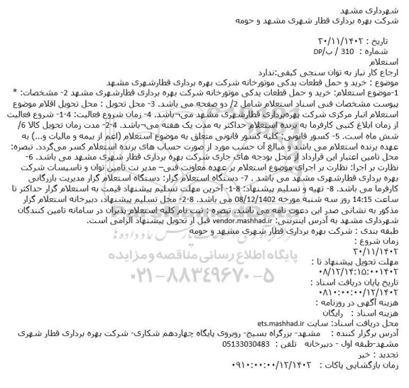 موضوع : خرید و حمل قطعات يدكي موتورخانه شرکت بهره برداری قطار شهری مشهد