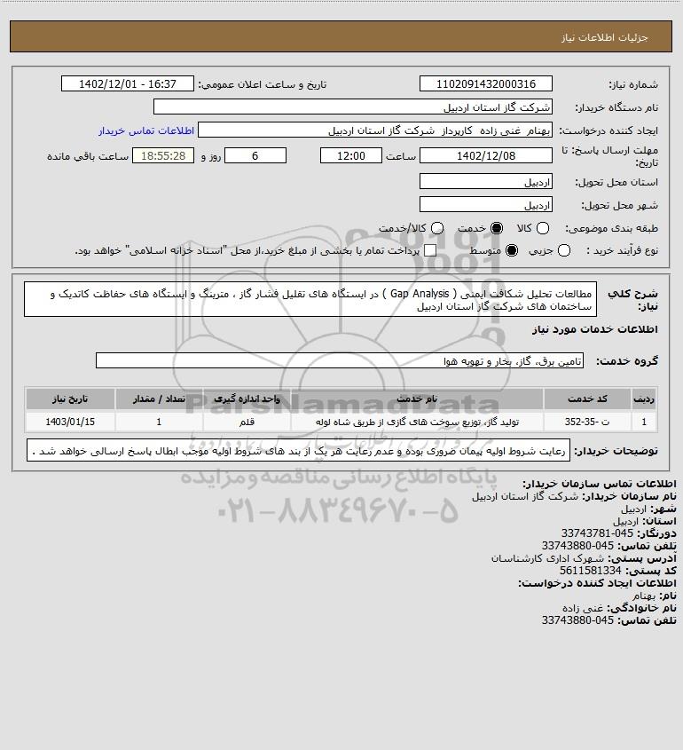 شرح کلی نیاز: مطالعات تحلیل شکافت ایمنی ( Gap Analysis ) در ایستگاه های تقلیل فشار گاز ، مترینگ و ایستگاه های حفاظت کاتدیک و ساختمان های شرکت گاز استان اردبیل