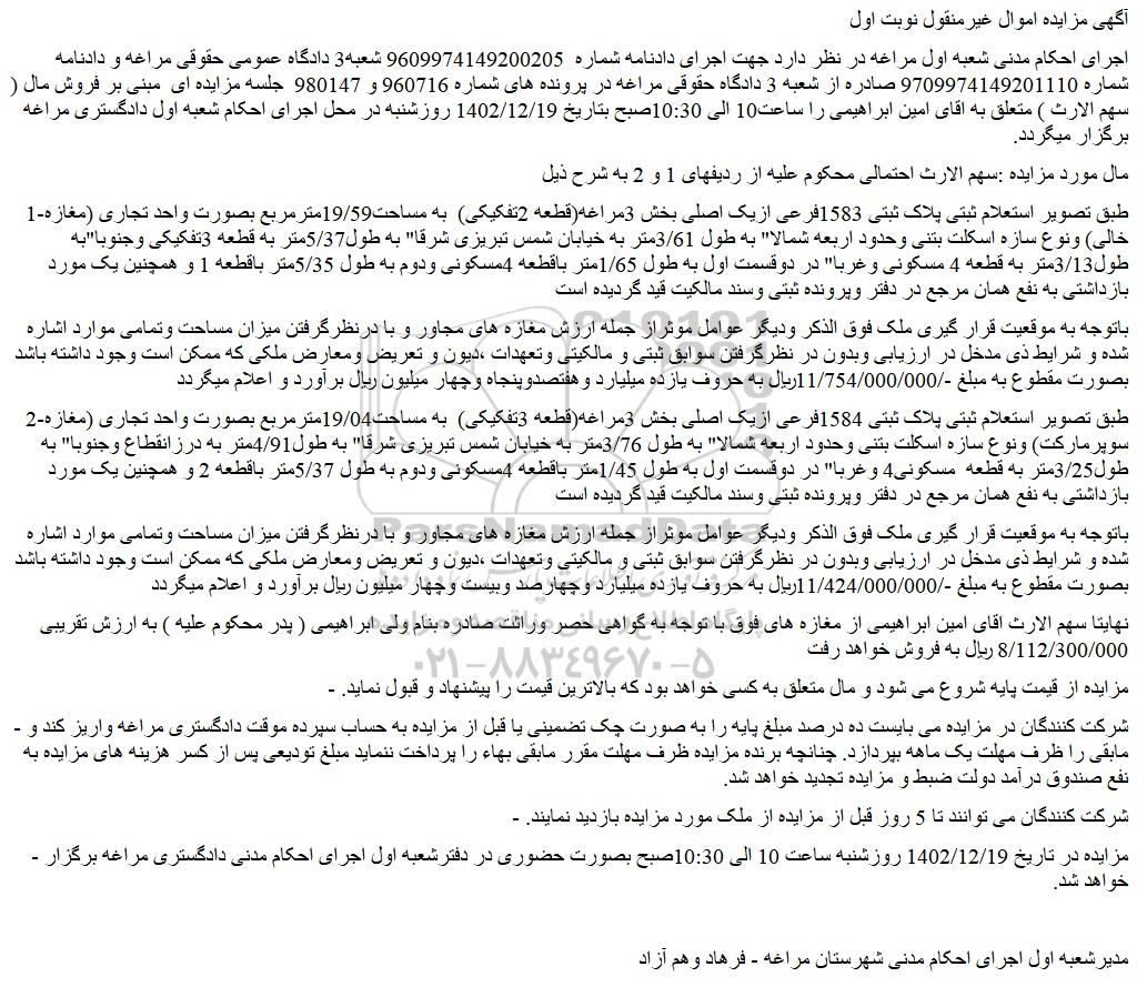 اجرای احکام مدنی شعبه اول مراغه در نظر دارد جهت اجرای دادنامه شماره  9609974149200205 شعبه3 دادگاه عمومی حقوقی مراغه و دادنامه شماره 9709974149201110 صادره از شعبه 3 دادگاه حقوقی مراغه در پرونده های شماره 960716 و 980147  جلسه مزایده ای  مبنی بر فروش مال ( سهم الارث ) متعلق به اقای امین ابراهیمی را ساعت10 الی 10:30صبح بتاریخ 1402/12/19 روزشنبه در محل اجرای احکام شعبه اول دادگستری مراغه برگزار میگردد.