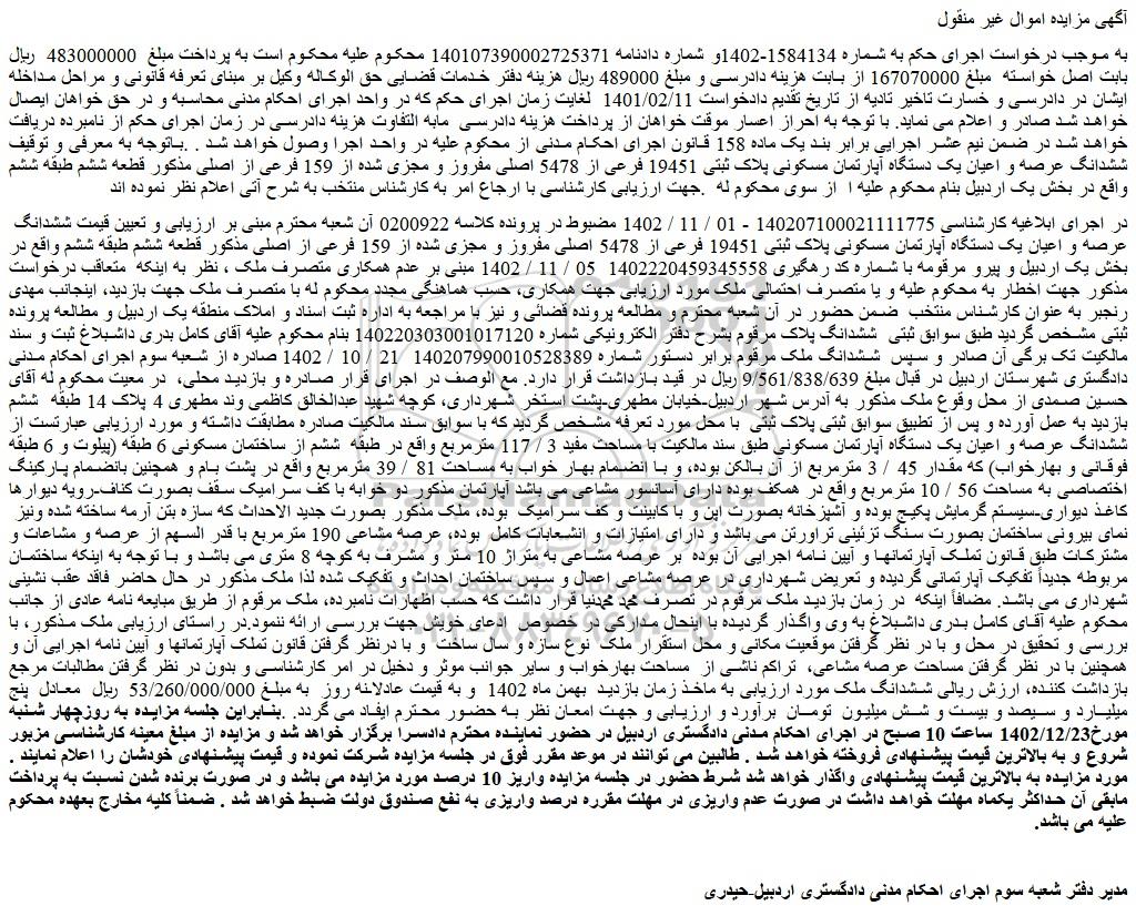به موجب درخواست اجرای حکم به شماره 1584134-1402و شماره دادنامه 140107390002725371 محکوم علیه محکوم است به پرداخت مبلغ 483000000 ریال بابت اصل خواسته مبلغ 167070000 از بابت هزینه دادرسی و مبلغ 489000 ریال هزینه دفتر خدمات قضایی حق الوکاله وکیل بر مبنای تعرفه قانونی و مراحل مداخله ایشان در دادرسی و خسارت تاخیر تادیه از تاریخ تقدیم دادخواست 1401/02/11 لغایت زمان اجرای حکم که در واحد اجرای احکام مدنی محاسبه و در حق خواهان ایصال خواهد شد صادر و اعلام می نماید. با توجه به احراز اعسار موقت خواهان از پرداخت هزینه دادرسی مابه التفاوت هزینه دادرسی در زمان اجرای حکم از نامبرده دریافت خواهد شد در ضمن نیم عشر اجرایی برابر بند یک ماده 158 قانون اجرای احکام مدنی از محکوم علیه در واحد اجرا وصول خواهد شد . .باتوجه به معرفی و توقیف ششدانگ عرصه و اعیان یک دستگاه آپارتمان مسکونی پلاک ثبتی 19451 فرعی از 5478 اصلی مفروز و مجزی شده از 159 فرعی از اصلی مذکور قطعه ششم طبقه ششم واقع در بخش یک اردبیل بنام محکوم علیه ا از سوی محکوم له .جهت ارزیابی کارشناسی با ارجاع امر به کارشناس منتخب به شرح آتی اعلام نظر نموده اند