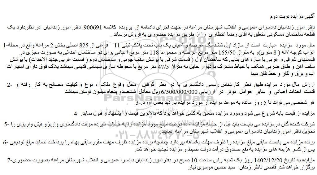 دفتر امور زندانیان دادسرای عمومی و انقلاب شهرستان مراغه در جهت اجرای دادنامه از پرونده کلاسه 900691 دفتر امور زندانیان در نظردارد یک قطعه ساختمان مسکونی متعلق به اقای رضا انتظاری را از طریق مزایده حضوری به فروش برساند .