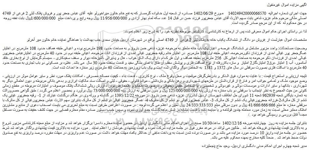 جهت اجرای شماره اجرائیه 140249420000066570 مورخ 1402/06/29 صادره از شعبه اول خانواده گرمسار که به نفع خانم خاتون میراخورلو علیه آقای عباس جعفر پور و فروش پلاک ثبتی 2 فرعی از 4749 اصلی ملکی مرحوم خانم عزیزه شاهی بابت سهم الارث آقای عباس جعفرپور فرزند حسن در قبال 14 عدد سکه تمام بهار آزادی و 11/956/000/000 ریال وجه رایج و پرداخت مبلغ 1/600/000/000ریال بابت نفقه روجه در حق محکوم له که از این مرجع صادر گردیده است.