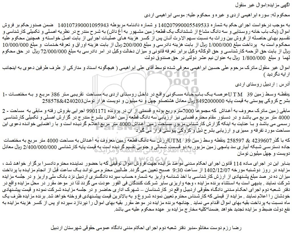 به موجب درخواست اجرای حکم به شماره 140207990005549533 و شماره دادنامه مربوطه 140107390001095943 ضمن صدورحکم بر فروش اموال (یک باب خانه روستایی و سه دانگ مشاع از ششدانگ یک قطعه زمین مشهور به آغ داش) به شرح مندرج در نظریه اصلی و تکمیلی کارشناسی و تقسیم بهای حاصله از فروش بین وراث به نسبت سهم الارث آنان پس از کسر هزینه های عملیات اجرایی از بابت اصل خواسته و همچنین محکوم علیه محکوم است به پرداخت مبلغ 1/000/000 ریال از بابت هزینه دادرسی و مبلغ 200/000 ریال از بابت هزینه اوراق و تعرفه خدمات و مبلغ 10/000/000 ریال از بابت حق الزحمه کارشناسی و حق الوکاله وکیل برابر تعرفه قانونی و میزان دخالت وکیل در امر دادرسی به مبلغ 72/000/000 ریال در حق محکوم لهما و مبلغ 1/800/000 ریال به عنوان نیم عشر دولتی در حق صندوق دولت