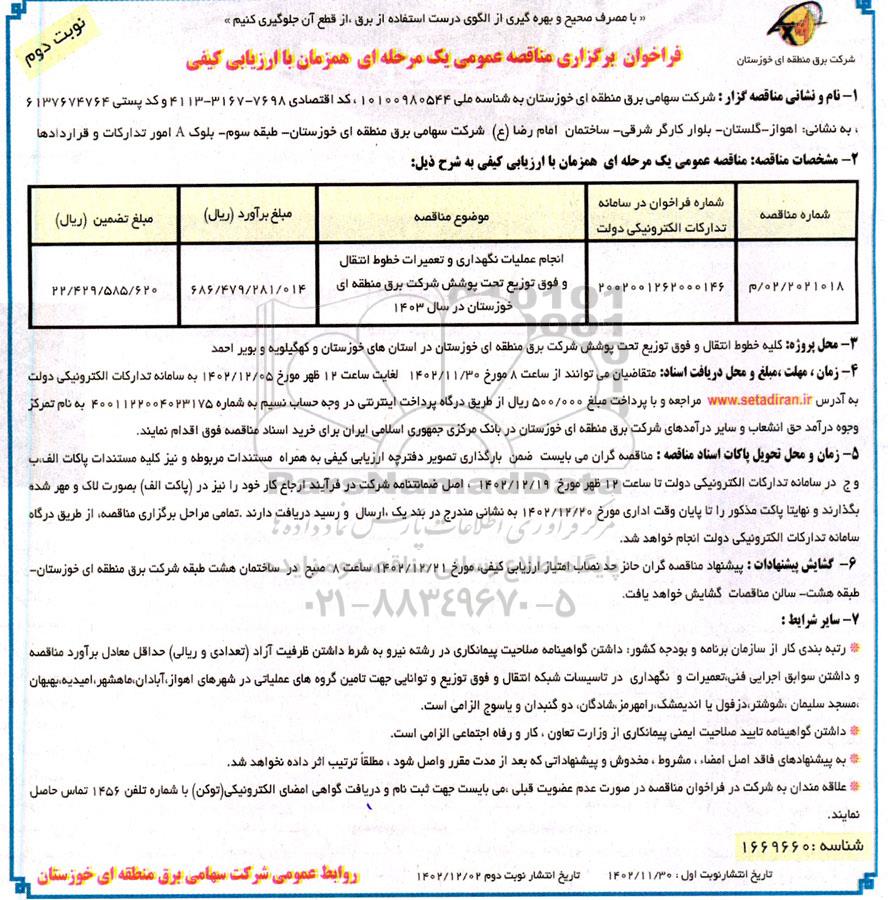 | م/02/2021018 | 2002001262000146 | انجام عملیات نگهداری و تعمیرات خطوط انتقال و فوق توزیع تحت پوشش شرکت برق منطقه ای خوزستان در سال 1403 | 686.479.281.014 | 22.429.585.620 |