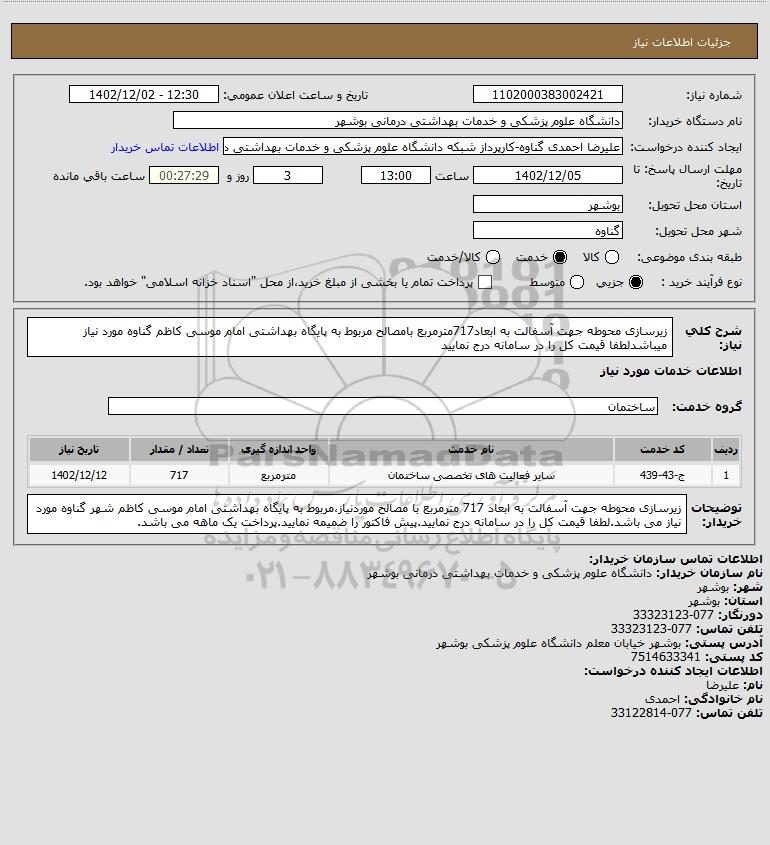شرح کلی نیاز: زیرسازی محوطه جهت آسفالت به ابعاد717مترمربع بامصالح مربوط به پایگاه بهداشتی امام موسی کاظم گناوه مورد نیاز میباشدلطفا قیمت کل را در سامانه درج نمایید