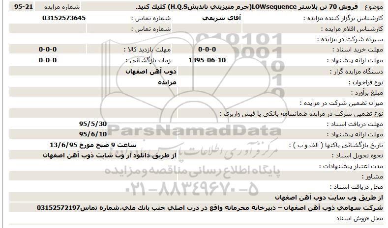 مزایده عمومی مزایده فروش 70 تن پلاستر LOWSEQUENCE برگزار میگردد. از کلیه افراد متخصص و شرکتهای واجد شرایط دعوت به عمل میآید تا در این مزایده با کد خبرگزاری پارس نماد : 710186 شرکت نمایند تاریخ شروع مزایده : 1395/05/25 مهلت شرکت در مزایده: تا پایان روز 1395/05/30 مکان برگزاری اموال واگذاری استانهای اصفهان و دستهبندیهای مربوط به این حراجی استیل و اهن نسوز میباشد.
