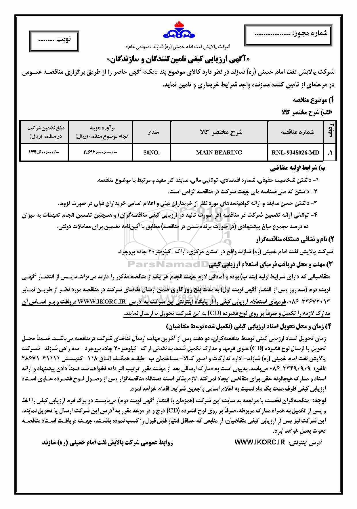 علاقه‌مندان می‌توانند جهت دریافت اسناد و اطلاعات تکمیلی، ارزیابی کیفی MAIN BEARING با سامانه مناقصات و مزایدات ایران پارس‌نماد داده ها 88349670 تماس حاصل نمایند.
