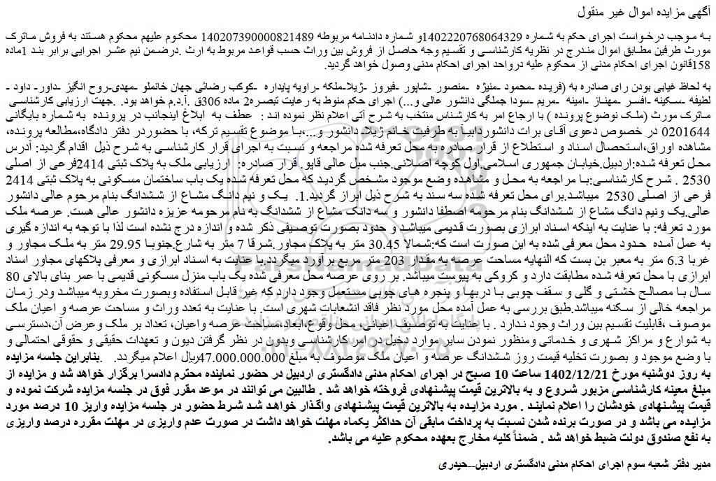 به لحاظ غیابی بودن رای صادره به (فریده -محمود -منیژه -منصور -شاپور -فیروز -ژیلا-ملکه -راویه پایداره -کوکب رضائی جهان خانملو -مهدی-روح انگیز -داور- داود -لطیفه -سکینه -افسر -مهناز -امینه -مریم -سودا جملگی دانشور عالی و...) اجرای حکم منوط به رعایت تبصره2 ماده 306ق .آ.د.م خواهد بود. .جهت ارزیابی کارشناسی ماترک مورث (ملک نوضوع پرونده ) با ارجاع امر به کارشناس منتخب به شرح آتی اعلام نظر نموده اند : عطف به ابلاغ اینجانب در پرونده به شماره بایگانی 0201644 در خصوص دعوی آقای برات دانشوردابیآ به طرفیت خانم ژیلا دانشور و...،با موضوع تقسیم ترکه، با حضوردر دفتر دادگاه،مطالعه پرونده، مشاهده اوراق،استحصال اسناد و استطلاع از قرار صادره به محل تعرفه شده مراجعه و نسبت به اجرای قرار کارشناسی به شرح ذیل اقدام گردید: آدرس محل تعرفه شده:اردبیل.خیابان جمهوری اسلامی.اول کوچه اصلانی.جنب مبل عالی قاپو. قرار صادره: ارزیابی ملک به پلاک ثبتی 2414فرعی از اصلی 2530 . شرح کارشناسی:با مراجعه به محل و مشاهده وضع موجود مشخص گردید که محل تعرفه شده یک باب ساختمان مسکونی به پلاک ثبتی 2414 فرعی از اصلی 2530 میباشد.برای محل تعرفه شده سه سند به شرح ذیل ابراز گردید.1. یک و نیم دانگ مشاع از ششدانگ بنام مرحوم عالی دانشور عالی.یک ونیم دانگ مشاع از ششدانگ بنام مرحومه اصطفا دانشور و سه دانک مشاع از ششدانگ به نام مرحومه عزیزه دانشور عالی هست. عرصه ملک مورد تعرفه: با عنایت به اینکه اسناد ابرازی بصورت قدیمی میباشد و حدود بصورت توصیفی ذکر شده و اندازه درج نشده است لذا با توجه به اندازه گیری به عمل آمده حدود محل معرفی شده به این صورت است که:شمالا 30.45 متر به پلاک مجاور.شرقا 7 متر به شارع.جنوبا 29.95 متر به ملک مجاور و غربا 6.3 متر به معبر بن بست که النهایه مساحت عرصه به مقدار 203 متر مربع برآورد میگردد.با عنایت به اسناد ابرازی و معرفی پلاکهای مجاور اسناد ابرازی با محل تعرفه شده مطابقت دارد و کروکی به پیوست میباشد. بر روی عرصه محل معرفی شده یک باب منزل مسکونی قدیمی با عمر بنای بالای 80 سال با مصالح خشتی و گلی و سقف چوبی با دربها و پنجره های چوبی مستعمل وجود دارد که غیر قابل استفاده وبصورت مخروبه میباشد ودر زمان مراجعه خالی از سکنه میباشد.طبق بررسی به عمل آمده محل مورد نظر فاقد انشعابات شهری است. با عنایت به تعدد وراث و مساحت عرصه و اعیان ملک موصوف ،قابلیت تقسیم بین وراث وجود ندارد . با عنایت به توصیف اعیانی، محل وقوع،ابعاد،مساحت عرصه واعیان، تعداد بر ملک وعرض آن،دسترسی به شوارع و مراکز شهری و خدماتی ومنظور نمودن سایر موارد دخیل در امر کارشناسی وبدون در نظر گرفتن دیون و تعهدات حقیقی و حقوقی احتمالی و با وضع موجود و بصورت تخلیه قیمت روز ششدانگ عرصه و اعیان ملک موصوف به مبلغ 47.000.000.000ریال اعلام میگردد. .بنابراین جلسه مزایده به روز دوشنبه مورخ 1402/12/21 ساعت 10 صبح در اجرای احکام مدنی دادگستری اردبیل در حضور نماینده محترم دادسرا برگزار خواهد شد و مزایده از مبلغ معینه کارشناسی مزبور شروع و به بالاترین قیمت پیشنهادی فروخته خواهد شد . طالبین می توانند در موعد مقرر فوق در جلسه مزایده شرکت نموده و قیمت پیشنهادی خودشان را اعلام نمایند . مورد مزایده به بالاترین قیمت پیشنهادی واگذار خواهد شد شرط حضور در جلسه مزایده واریز 10 درصد مورد مزایده می باشد و در صورت برنده شدن نسبت به پرداخت مابقی آن حداکثر یکماه مهلت خواهد داشت در صورت عدم واریزی در مهلت مقرره درصد واریزی به نفع صندوق دولت ضبط خواهد شد . ضمناً کلیه مخارج بعهده محکوم علیه می باشد.