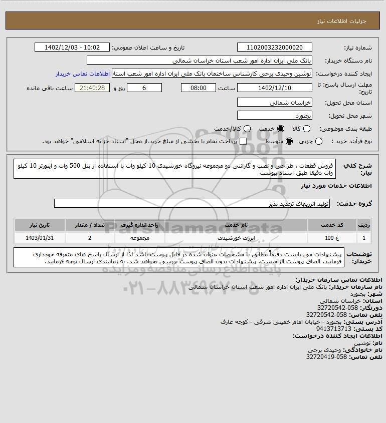 شرح کلی نیاز: فروش قطعات ، طراحی و نصب و گارانتی دو مجموعه نیروگاه خورشیدی 10 کیلو وات با استفاده از پنل 500 وات و اینورتر 10 کیلو وات دقیقاَ طبق اسناد پیوست