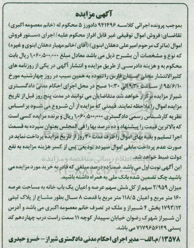 مزایده میزان 2.959 سهم از کل شش سهم یکباب خانه, مزایده,مزایده میزان 2.959 سهم از کل شش سهم یکباب خانه