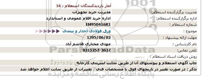 استعلام بها و موضوع استعلام استعلام ورق فولادی آجدار و نبشی به اطلاع کلیه شرکتها و افراد متخصص واجد شرایط میرساند، آگهی گذار در نظر دارد از طریق استعلام بها، نسبت به انتخاب و دریافت پیشنهادات اقدام نماید. این استعلام با کد آگهی ثبت شده در سامانه خبرگزاری پارس نماد : 710810 منتشر شده است. مشخصات استعلام : تاریخ شروع استعلام: 1395/05/26 آخرین مهلت ارسال پیشنهاد قیمت : 1395/06/02 و محل اجرای پروژه : استان اصفهان میباشد. استعلام قیمت مورد درخواست : استعلام ورق فولادی آجدار و نبشی با دستهبندیهای تخصصی و گروه های مرتبط : آهن آلات, انواع ورق, استعلام اطلاع رسانی میگردد.