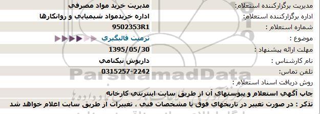 اداره برگزارکننده استعلام : اداره خرید مواد شیمیایی و روانکارها