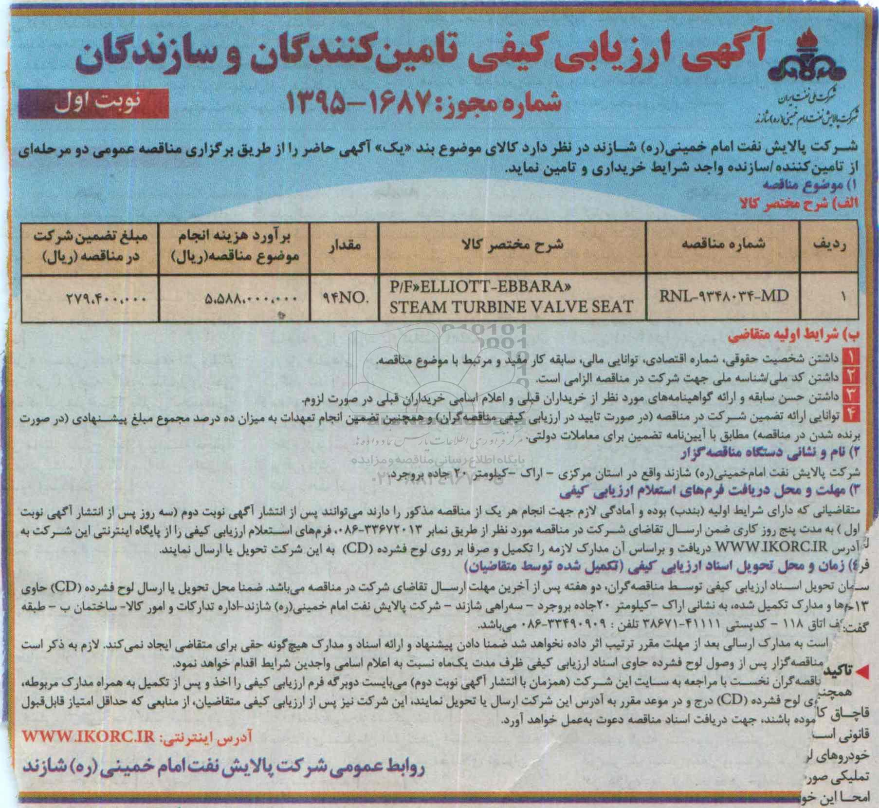 ارزیابی کیفی ELLIOTT-EBBARA STEAM TURBINE VALVE SEAT از کلیه افراد متخصص و شرکتها واجد شرایط دعوت به عمل میآید در مناقصه با کد خبرگزاری پارس نماد: 710952 شرکت نمایند.
