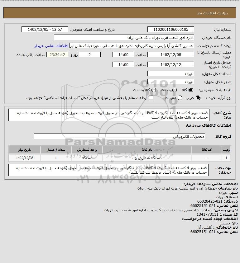 شرح کلی نیاز: فقط سورتر 4 کاسته مدل گلوری UWF-4 نو اکبند گارانتی دار تحویل فوری تسویه بعد نحویل (هزینه حمل با فروشنده - شماره حساب در بانک ملی) مورد نیاز است