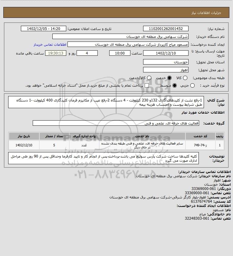 2-رفع عیب از مکانیزم فرمان کلیدگازی 400 کیلوولت -1 دستگاه طبق شرایط پیوست و احتساب هزینه بیمه