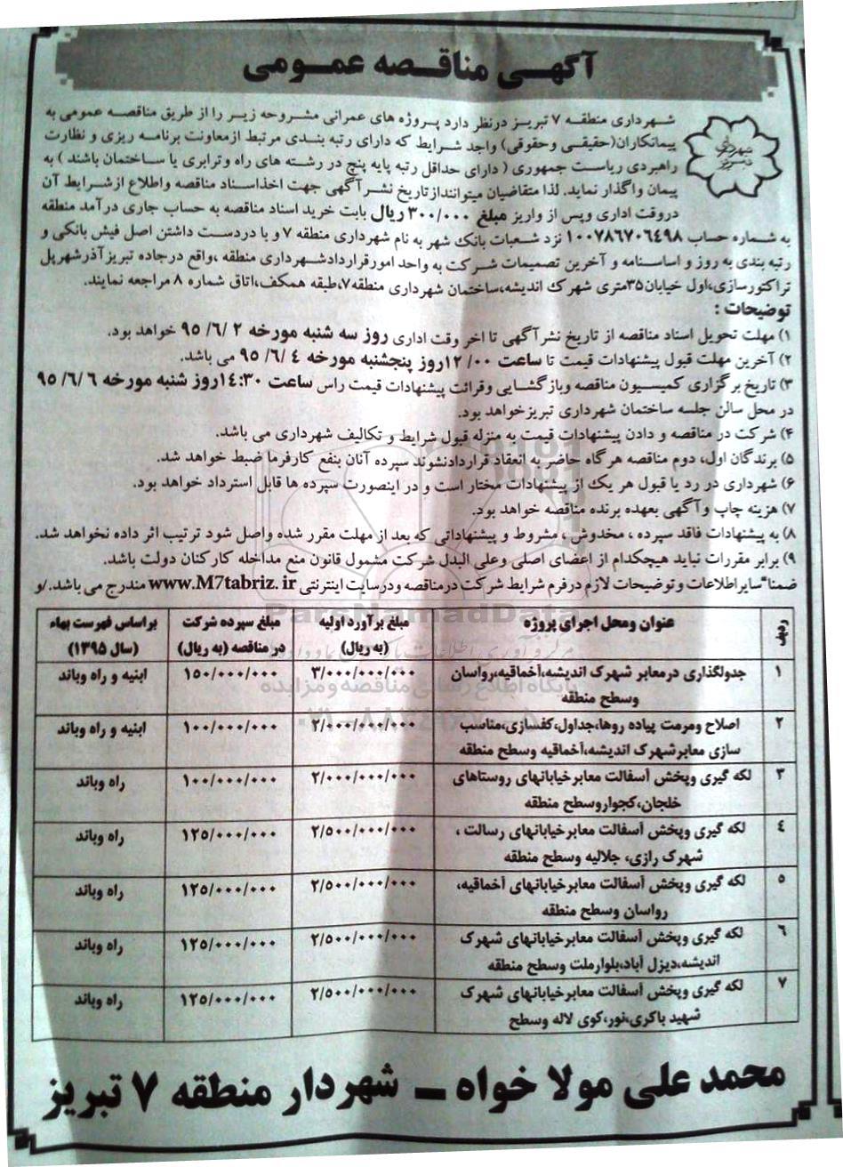 شهرداری منطقه 7 تبریز در نظر دارد پروژه های عمرانی مشروحه زیر را از طریق مناقصه عمومی به متقاضیان (حقیقی و حقوقی) واجد شرایط که دارای رتبه بندی مرتبط از معاونت برنامه ریزی و نظارت راهبردی ریاست جمهوری (دارای حداقل رتبه پایه پنج در رشته های راه و ترابری یا ساختمان باشند) به پیمان واگذار نماید. لذا متقاضیان می توانند از تاریخ نشر آگهی جهت اخذ اسناد مناقصه و اطلاع از شرایط آن در وقت اداری و پس از واریز مبلغ 300.000 ریال بابت خرید اسناد مناقصه به حساب جاری درآمد منطقه به شماره حساب 100786706498 نزد شعبات بانک شهر به نام شهرداری منطقه 7 و با در دست داشتن اصل فیش بانکی و رتبه بندی به روز و اساسنامه و آخرین تصمیمات شرکت به واحد امور قرارداد شهرداری منطقه واقع در جاده تبریز آذرشهر پل تراکتورسازی، اول خیابان 35 متری شهرک اندیشه، ساختمان شهرداری منطقه 7، طبقه همکف، اتاق شماره 8 مراجعه نمایند.