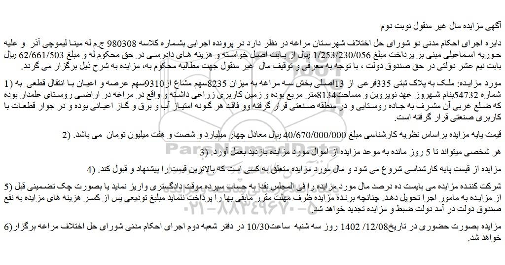 مزایده فروش ملک به پلاک ثبتی 335فرعی از 13اصلی , مزایده فروش ملک به پلاک ثبتی 335فرعی از 13اصلی