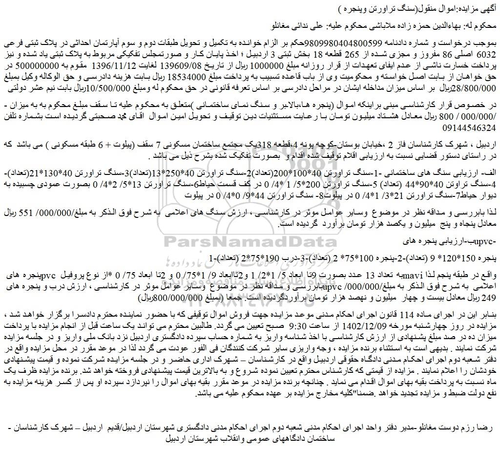 بنابر این در اجرای ماده 114 قانون اجرای احکام مدنی موعد مزایده جهت فروش اموال توقیفی که با حضور نماینده محترم دادسرا برگزار خواهد شد ، مزایده در روز چهارشنبه مورخه 1402/12/09 از ساعت 9:30 صبح تعیین می گردد. طالبین محترم می تواند یک ساعت قبل از انجام مزایده با پرداخت میزان ده در صد مبلغ پشنهادی از ارزش کارشناسی با اخذ شناسه واریز به شماره حساب سپرده دادگستری اردبیل نزد بانک ملی واریز و در جلسه مزایده شرکت نمایند . بدیهی است به استثناء برنده مزایده ، وجه واریزی سایر شرکت کنندگان فی الفور عودت می گردد لذا در موعد مقرر در محل مزایده واقع در دفتر شعبه دوم اجرای احکام مدنی دادگاه حقوقی اردبیل واقع در کارشناسان – شهرک اداری حاضر و در جلسه مزایده شرکت نموده و قیمت پیشنهادی خودشان را اعلام نمایند . مزایده از قیمتی که کارشناس محترم تعیین نموده شروع و به بالاترین قیمت پیشنهادی فروخته خواهد شد. برنده مزایده ظرف یک ماه نسبت به پرداخت بقیه بهای اموال اقدام می نماید . چنانچه برنده مزایده در موعد مقرر بقیه بهای اموال را نپردازد سپرده او پس از کسر هزینه مزایده به نفع دولت ضبط و مزایده تجدید خواهد .ضمنا"کلیه مخارج مزایده بر عهده محکوم علیه می باشد.