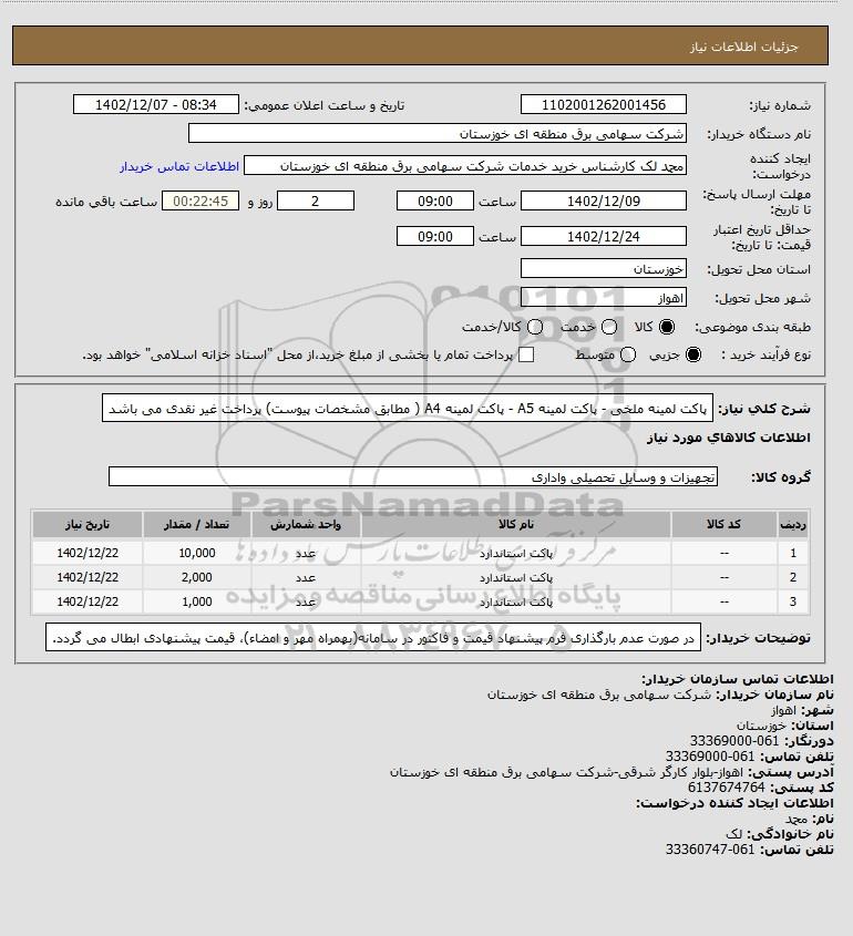 استعلام پاکت لمینه ملخی - پاکت لمینه A5 - پاکت لمینه A4 ( مطابق مشخصات پیوست) پرداخت غیر نقدی می باشد, استعلام پاکت لمینه ملخی - پاکت لمینه A5 - پاکت لمینه A4 ( مطابق مشخصات پیوست) پرداخت غیر نقدی می باشد