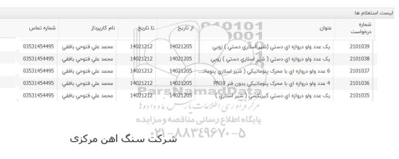 | 2101039 | یک عدد ولو دروازه ای دستی (شیر اسلاری دستی) زوبی | 1402.12.5 | 1402.12.12 | محمد علی فتوحی بافقی | 03531454495 |