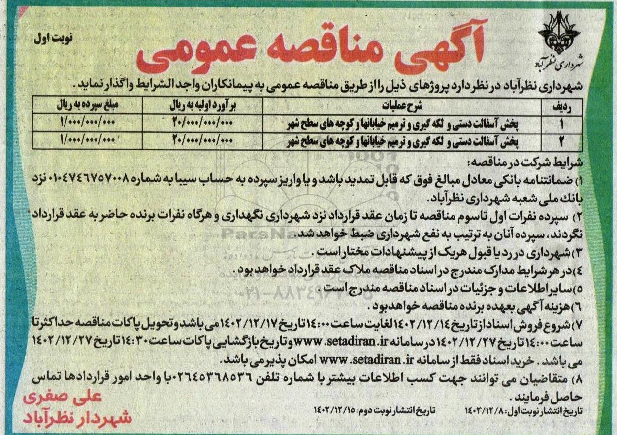 شهرداری نظرآباد پروژه های ذیل را از طریق مناقصه عمومی به پیمانکاران واجد شرایط واگذار نماید.