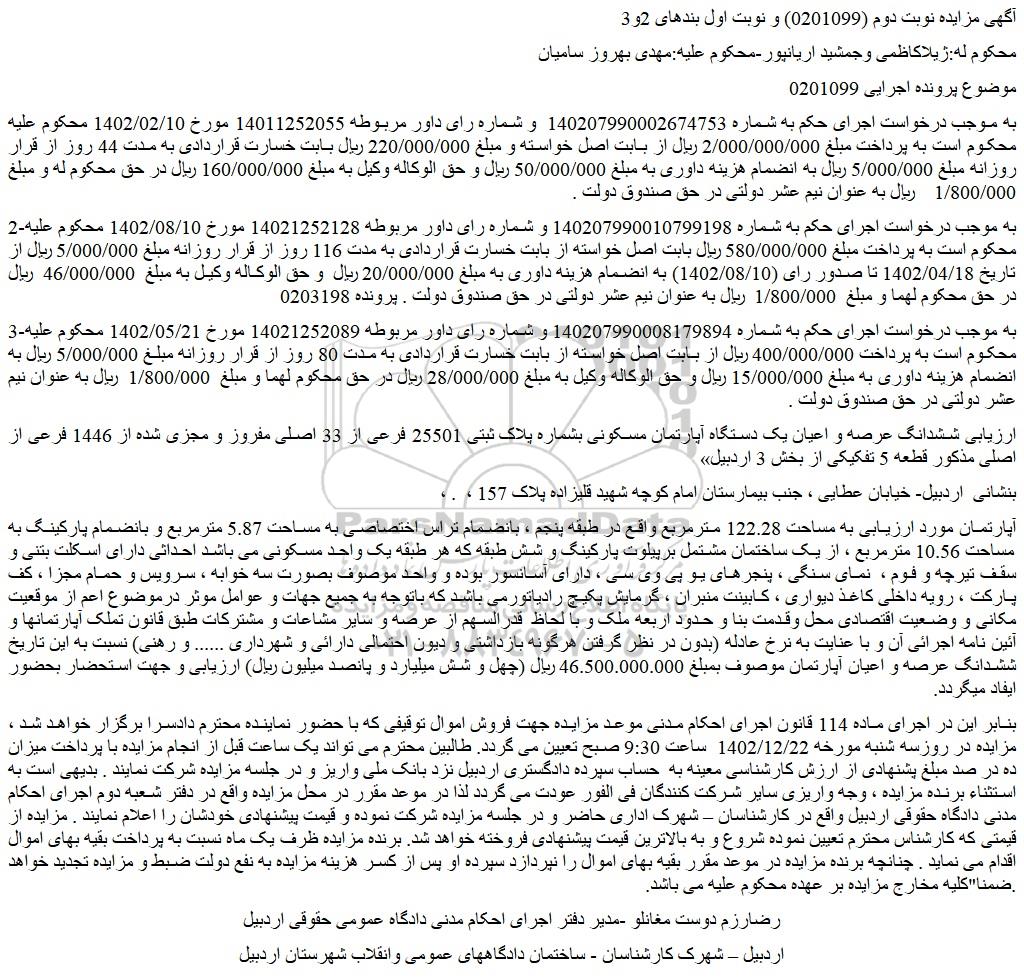 بنابر این در اجرای ماده 114 قانون اجرای احکام مدنی موعد مزایده جهت فروش اموال توقیفی که با حضور نماینده محترم دادسرا برگزار خواهد شد ، مزایده در روزسه شنبه مورخه 1402/12/22 ساعت 9:30 صبح تعیین می گردد. طالبین محترم می تواند یک ساعت قبل از انجام مزایده با پرداخت میزان ده در صد مبلغ پشنهادی از ارزش کارشناسی معینه به حساب سپرده دادگستری اردبیل نزد بانک ملی واریز و در جلسه مزایده شرکت نمایند . بدیهی است به استثناء برنده مزایده ، وجه واریزی سایر شرکت کنندگان فی الفور عودت می گردد لذا در موعد مقرر در محل مزایده واقع در دفتر شعبه دوم اجرای احکام مدنی دادگاه حقوقی اردبیل واقع در کارشناسان – شهرک اداری حاضر و در جلسه مزایده شرکت نموده و قیمت پیشنهادی خودشان را اعلام نمایند . مزایده از قیمتی که کارشناس محترم تعیین نموده شروع و به بالاترین قیمت پیشنهادی فروخته خواهد شد. برنده مزایده ظرف یک ماه نسبت به پرداخت بقیه بهای اموال اقدام می نماید . چنانچه برنده مزایده در موعد مقرر بقیه بهای اموال را نپردازد سپرده او پس از کسر هزینه مزایده به نفع دولت ضبط و مزایده تجدید خواهد .ضمنا"کلیه مخارج مزایده بر عهده محکوم علیه می باشد.