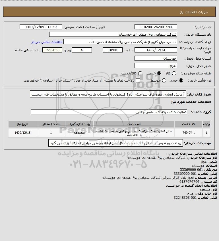 شرح کلی نیاز: آزمایش ارزیابی مقره های سرامیکی 120 کیلونیوتن با احتساب هزینه بیمه و مطابق با مشخصات فنی پیوست